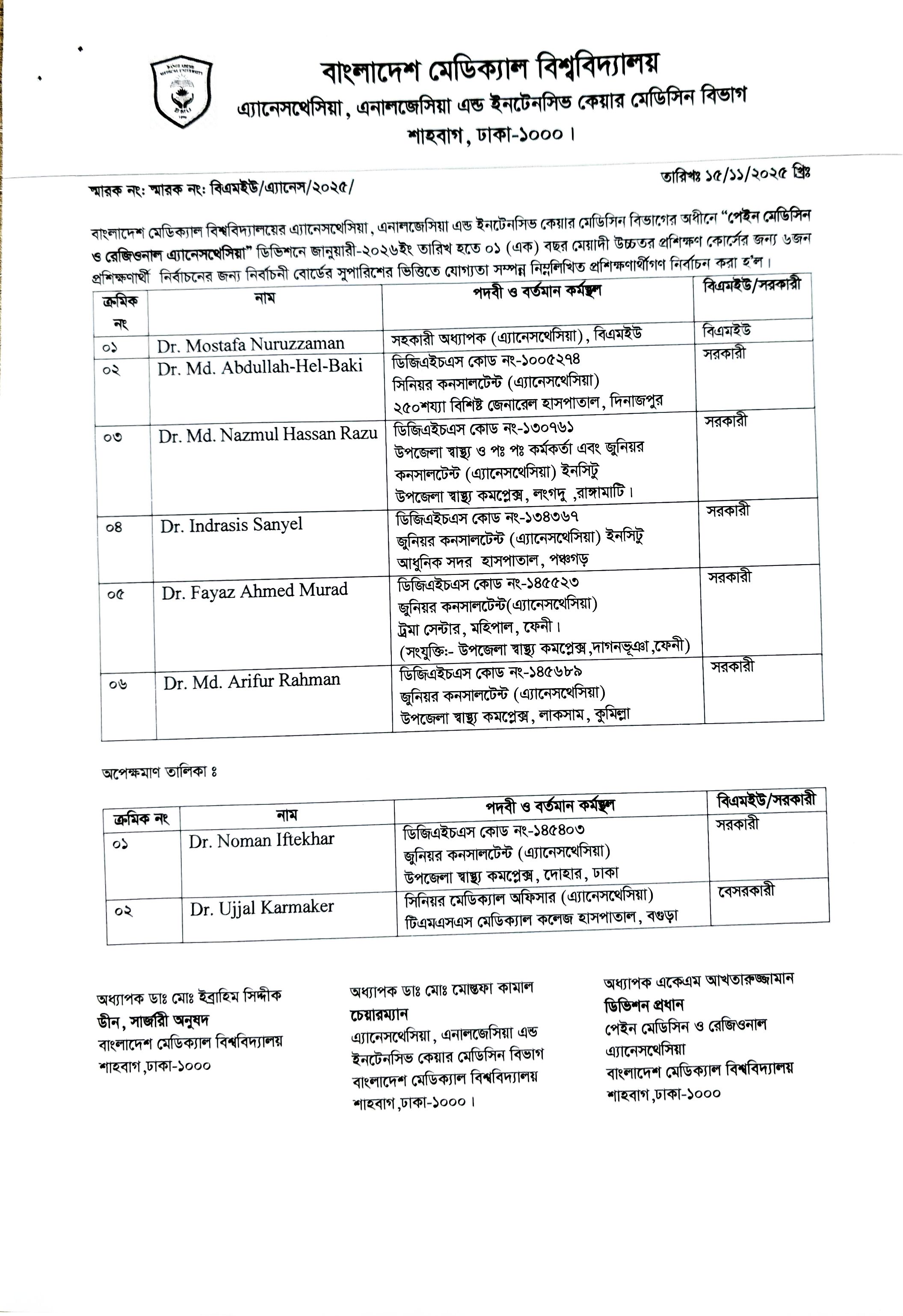 Eligible Candidate List for ' 1year Advanced Training in Pain Medicine and Regional Anaesthesia '